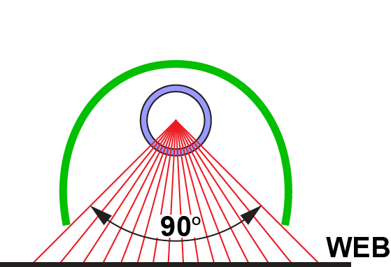 ランプから放射される紫外線の約 25% が硬化面に直接照射されます。これは、90° の角度で放射される光を示す画像 3 に示されています。残りの 75% の紫外線出力は、270° の反射鏡から放射され、焦点に集中します (画像 4)。このため、反射鏡を清潔に保ち、定期的に交換することが非常に重要です。反射鏡を清掃または交換しないと、反射エネルギーの量が大幅に減少し、不十分な硬化やライン速度の低下につながる一般的な原因となります。
